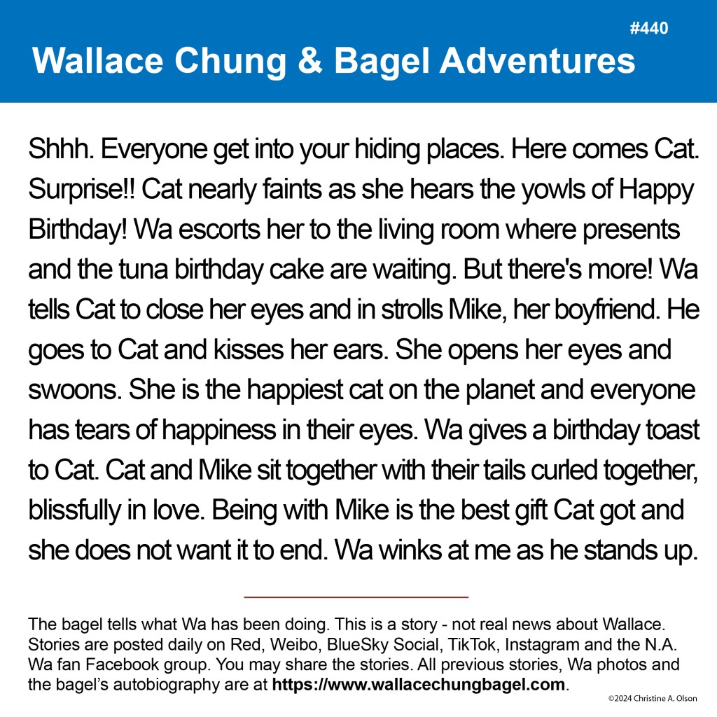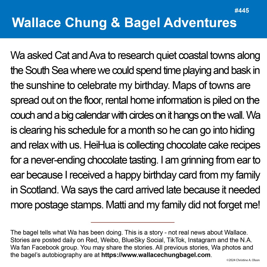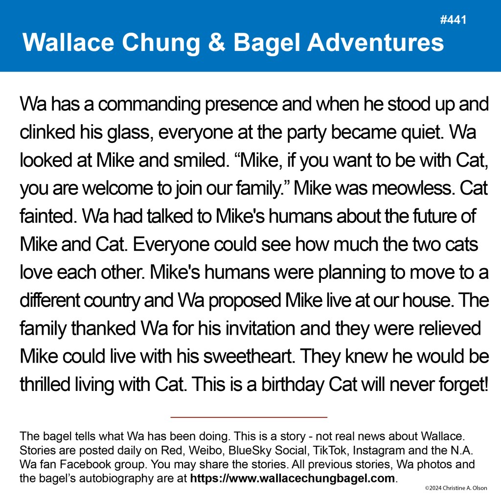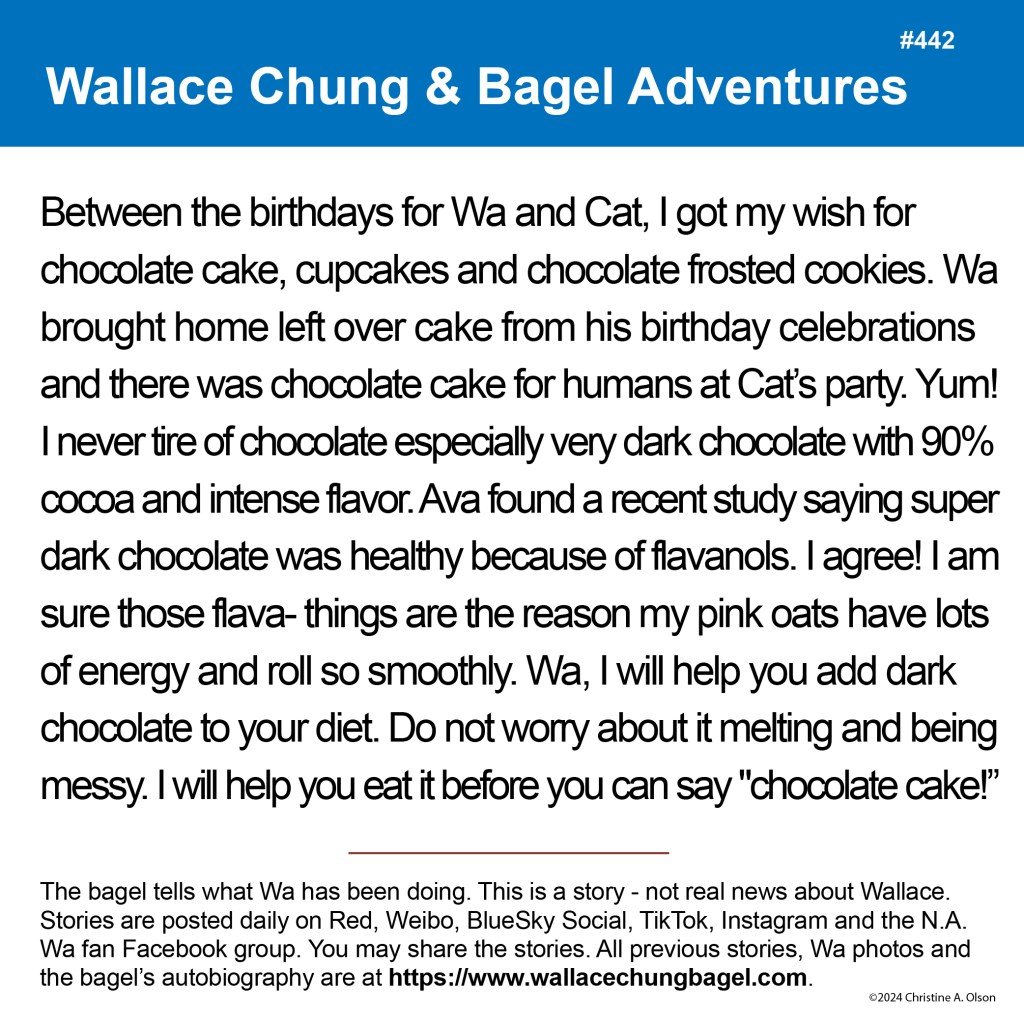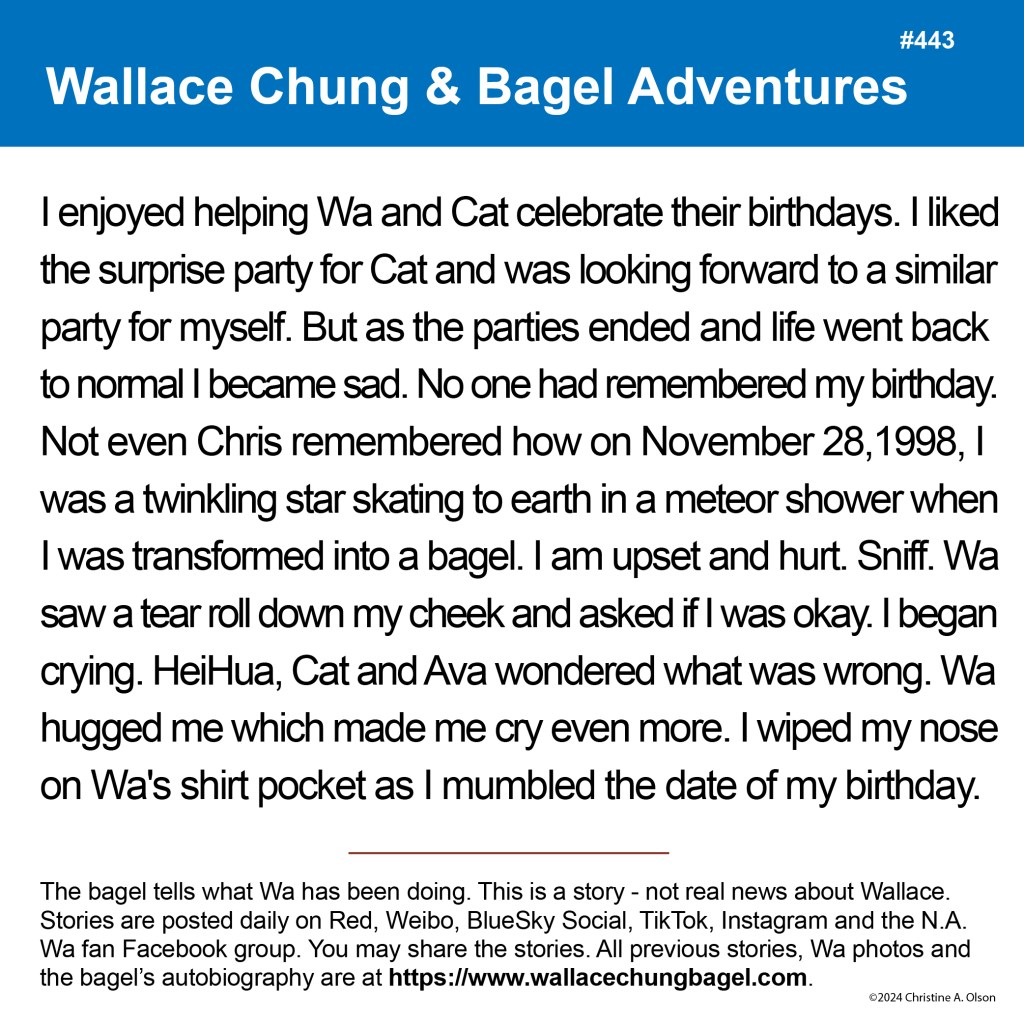When I began writing the bagel stories, I did not illustrate them with a photograph of Wallace. It was not until story #7 that I began including a photo of Wa that served as the inspiration for the storyline.